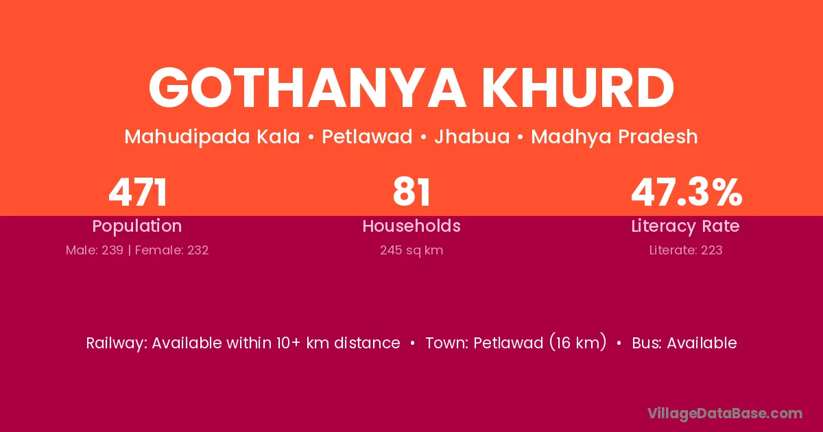 Petlawad (16 km) is the nearest town to Gothanya Khurd village for major economic activities and is located approximately 16 km away.