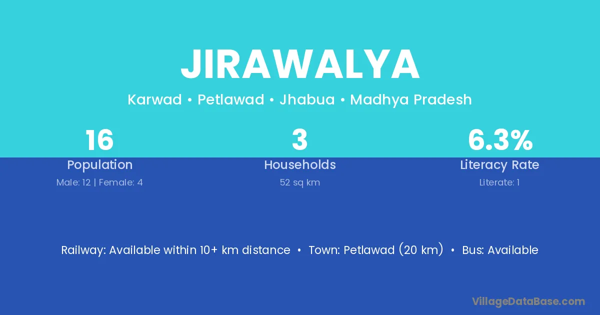 Petlawad (20 km) is the nearest town to Jirawalya village for major economic activities and is located approximately 20 km away.