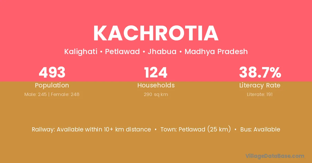 Petlawad (25 km) is the nearest town to Kachrotia village for major economic activities and is located approximately 25 km away.