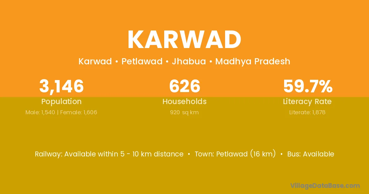 Petlawad (16 km) is the nearest town to Karwad village for major economic activities and is located approximately 16 km away.