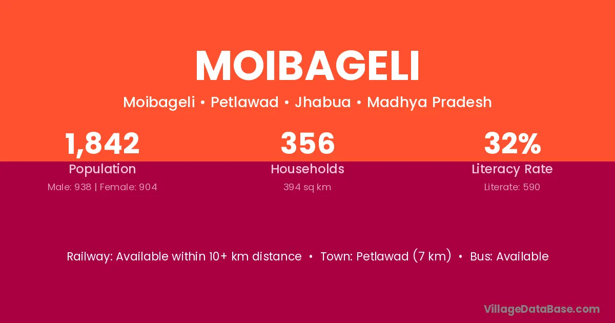 Petlawad (7 km) is the nearest town to Moibageli village for major economic activities and is located approximately 7 km away.