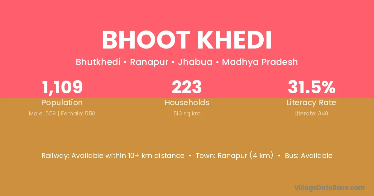 Bhoot Khedi village has a total population of 1,109 people, of which 559 are males and 550 are females.