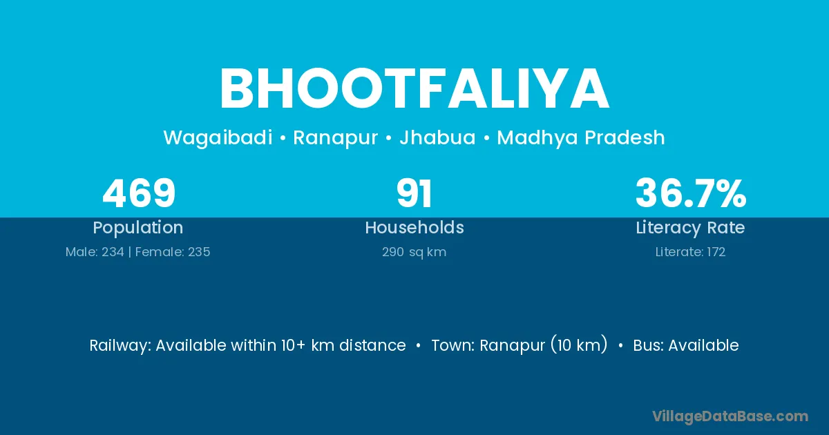 Bhootfaliya village has a total population of 469 people, of which 234 are males and 235 are females.
