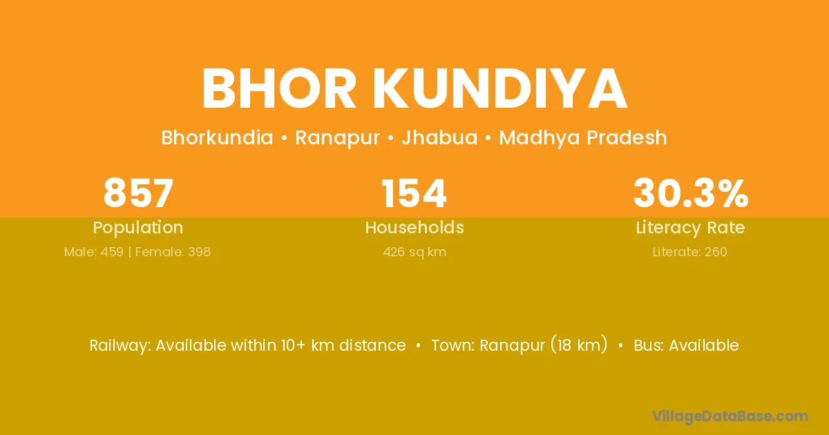 Ranapur (18 km) is the nearest town to Bhor Kundiya village for major economic activities and is located approximately 18 km away.