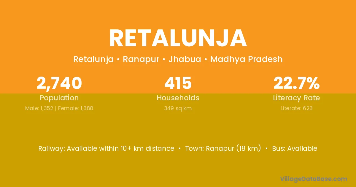 Ranapur (18 km) is the nearest town to Retalunja village for major economic activities and is located approximately 18 km away.