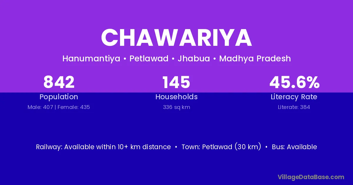 Thandla (20 km) is the nearest town to Chawariya village for major economic activities and is located approximately 20 km away.