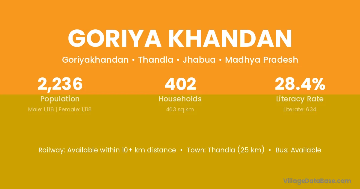Thandla (25 km) is the nearest town to Goriya Khandan village for major economic activities and is located approximately 25 km away.