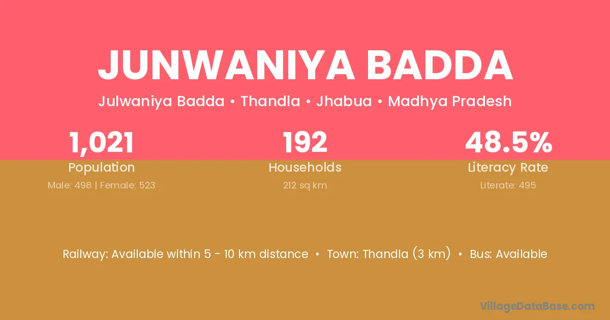 Junwaniya Badda village has a total population of 1,021 people, of which 498 are males and 523 are females.