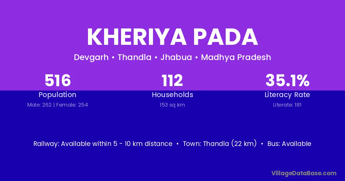 Thandla (22 km) is the nearest town to Kheriya Pada village for major economic activities and is located approximately 22 km away.