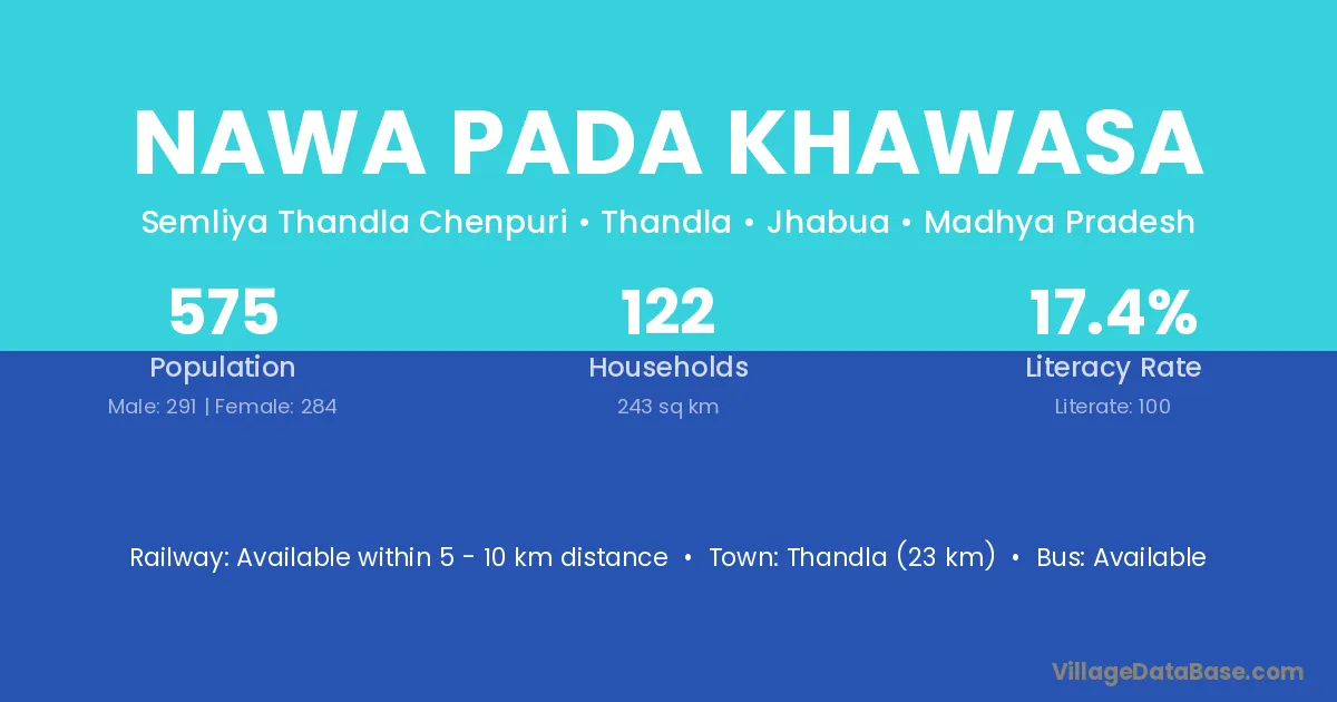 Thandla (23 km) is the nearest town to Nawa Pada Khawasa village for major economic activities and is located approximately 23 km away.