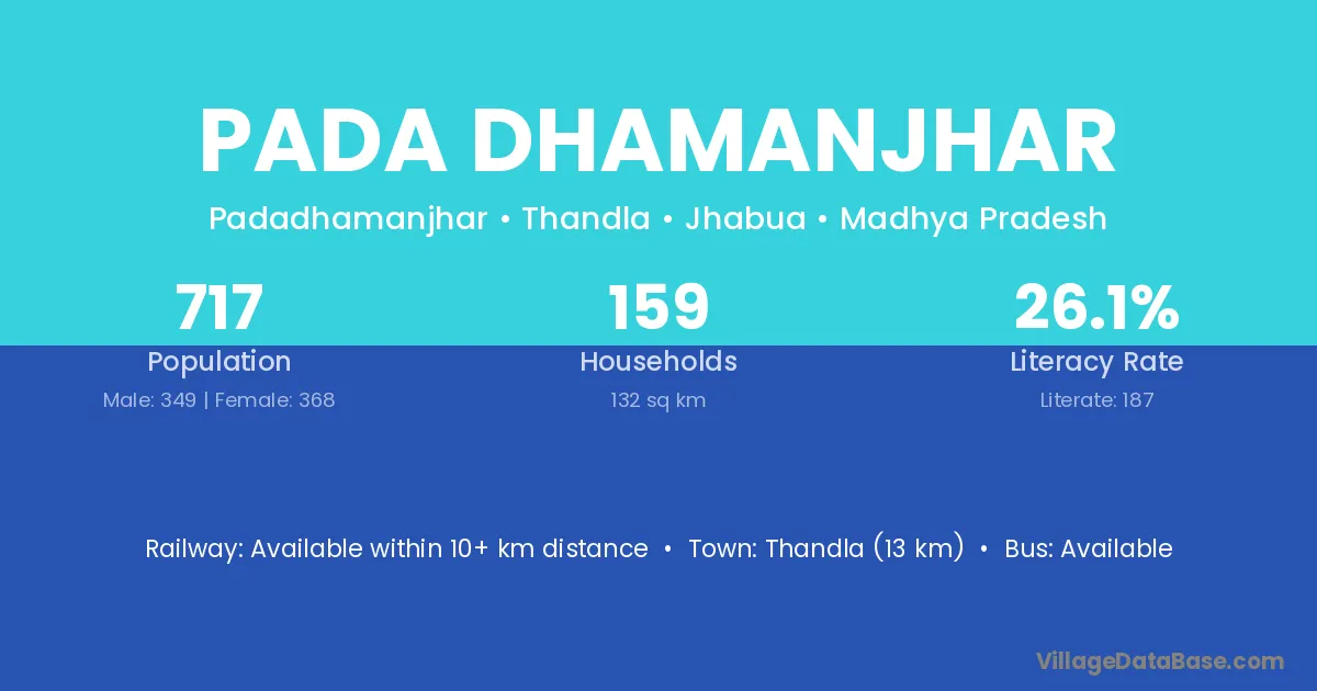 Thandla (13 km) is the nearest town to Pada Dhamanjhar village for major economic activities and is located approximately 13 km away.