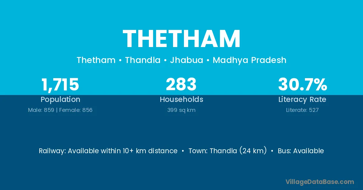 Thandla (24 km) is the nearest town to Thetham village for major economic activities and is located approximately 24 km away.