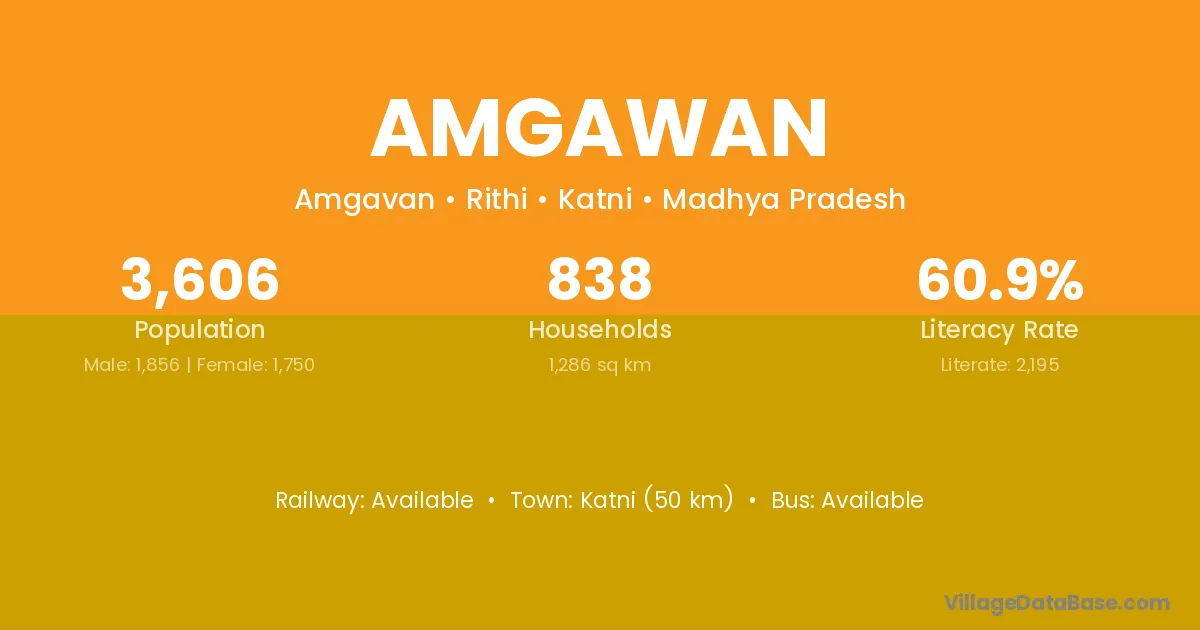 Katni (53 km) is the nearest town to Amgawan village for major economic activities and is located approximately 53 km away.