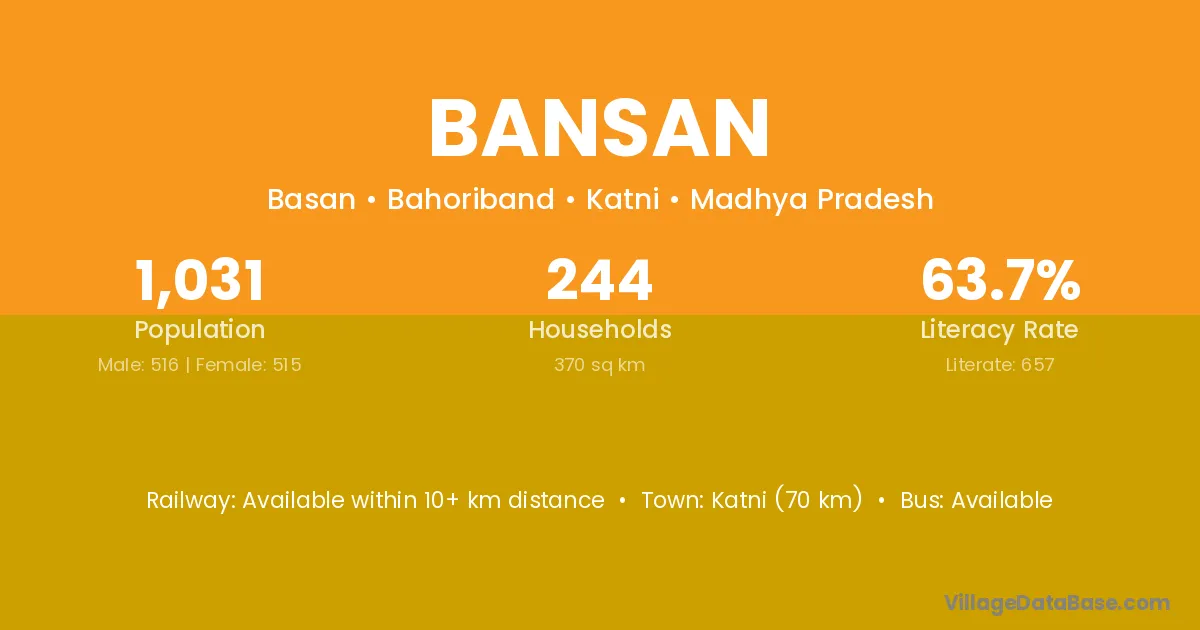Katni (70 km) is the nearest town to Bansan village for major economic activities and is located approximately 70 km away.