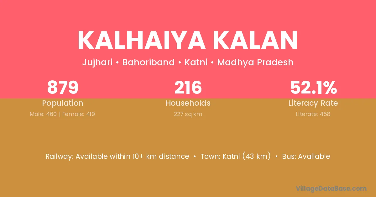 Kalhaiya Kalan village has a total population of 879 people, of which 460 are males and 419 are females.