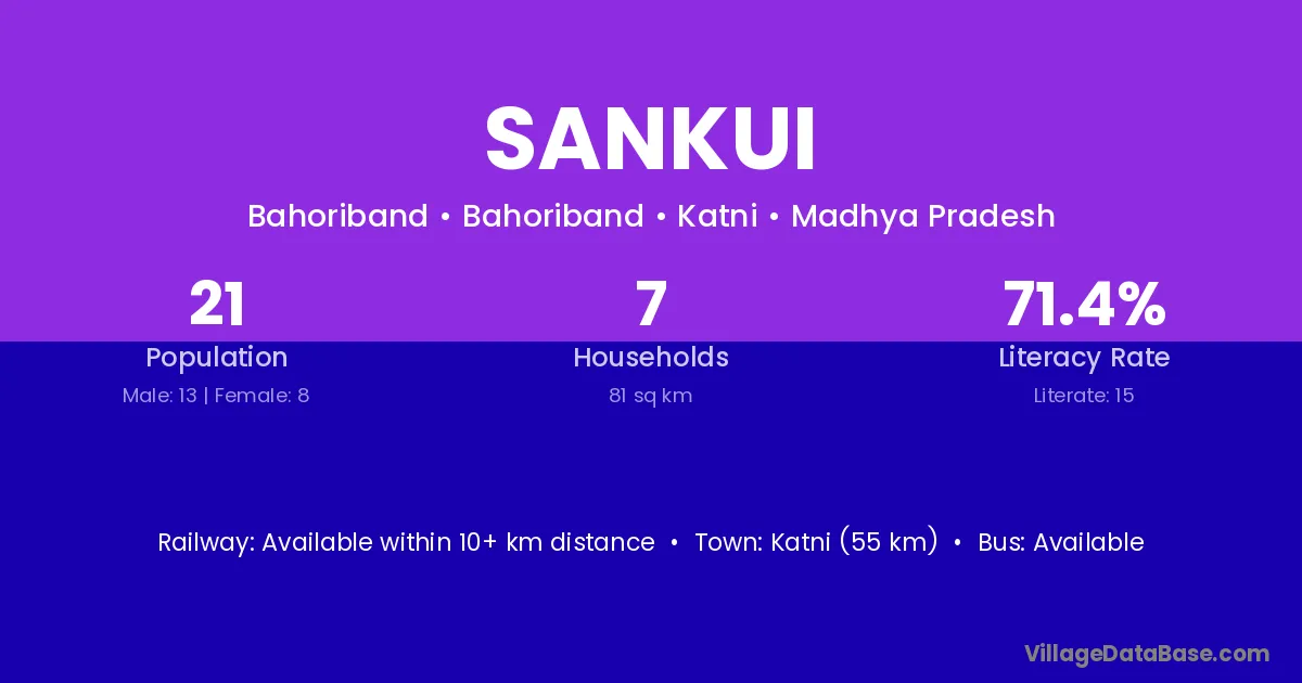 Katni (55 km) is the nearest town to Sankui village for major economic activities and is located approximately 55 km away.