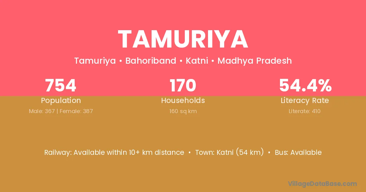 Katni (54 km) is the nearest town to Tamuriya village for major economic activities and is located approximately 54 km away.