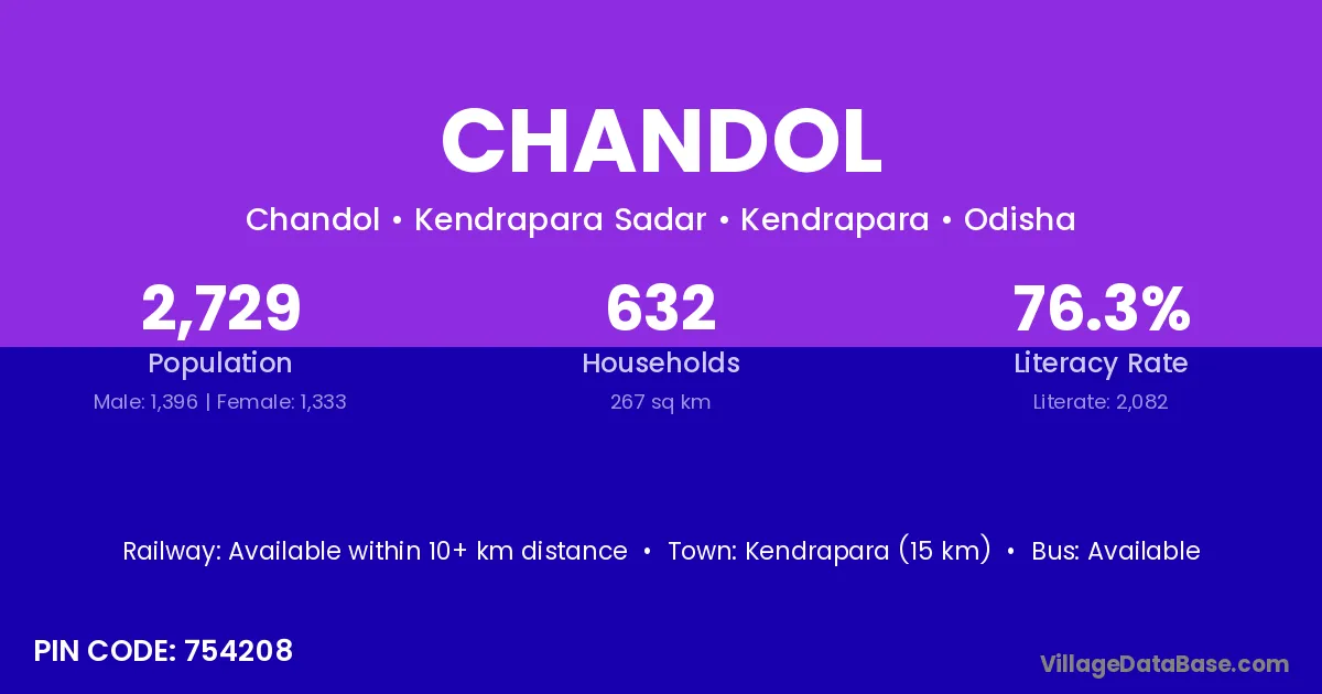 The literacy rate of Chandol village is 46.67%. Male literacy stands at 46.67% and female literacy at 46.67%.