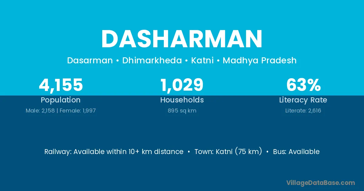Katni (75 km) is the nearest town to Dasharman village for major economic activities and is located approximately 75 km away.