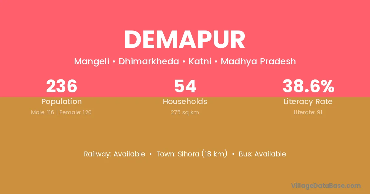 Sihora (18 km) is the nearest town to Demapur village for major economic activities and is located approximately 18 km away.