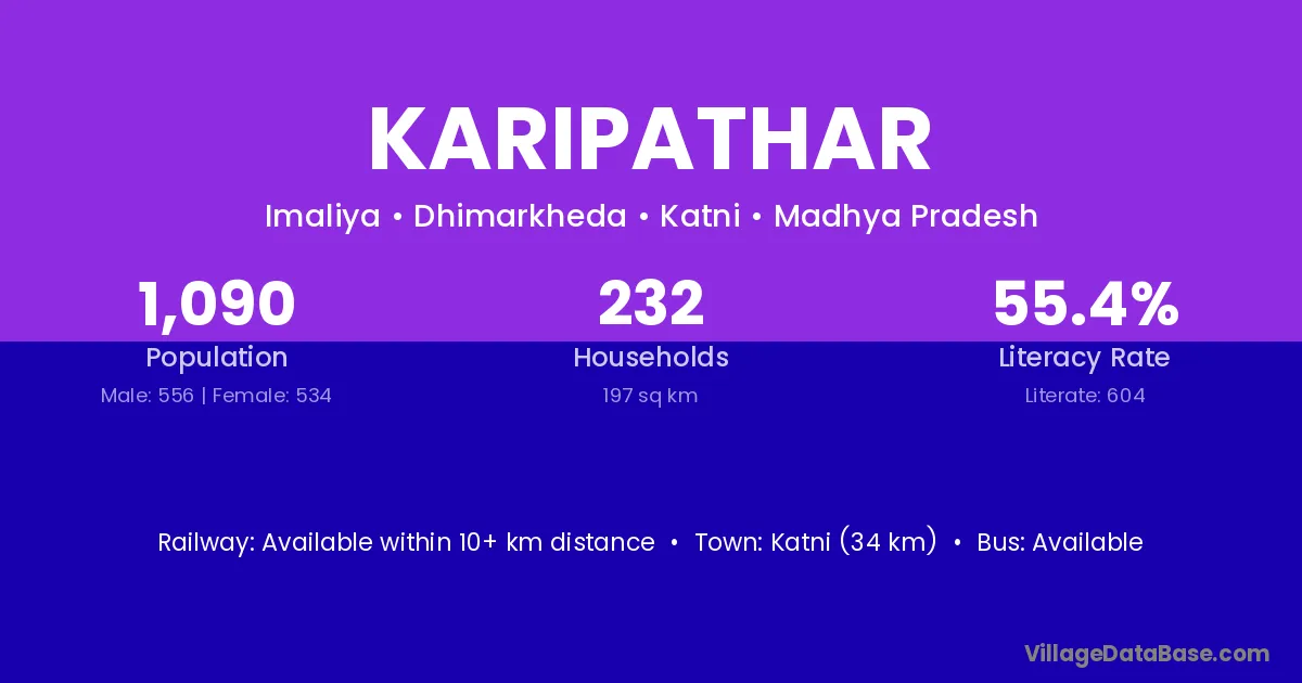 Katni (34 km) is the nearest town to Karipathar village for major economic activities and is located approximately 34 km away.