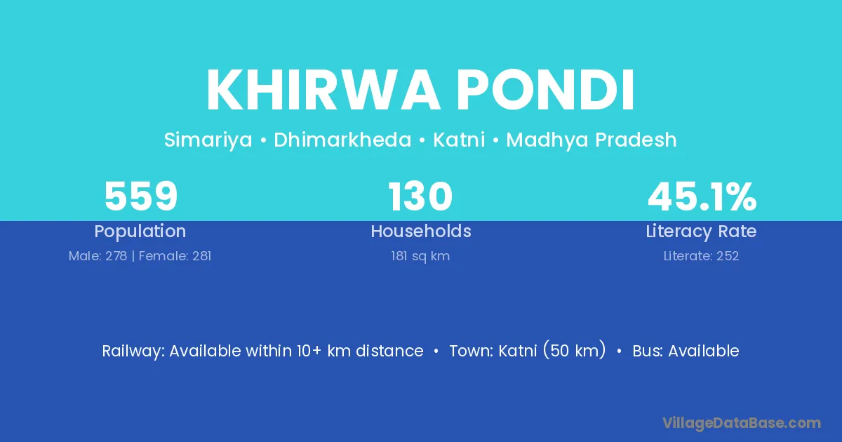 Katni (50 km) is the nearest town to Khirwa Pondi village for major economic activities and is located approximately 50 km away.