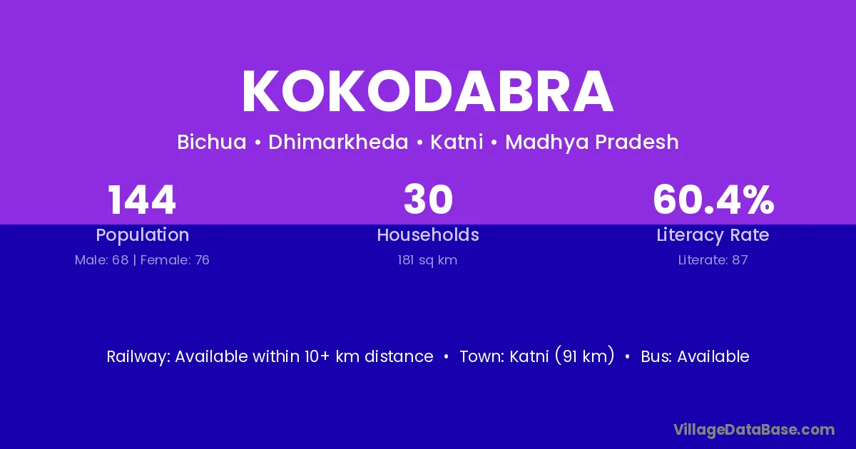 Katni (91 km) is the nearest town to Kokodabra village for major economic activities and is located approximately 91 km away.