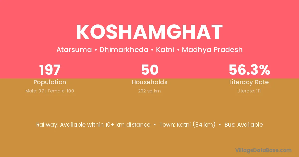 Katni (84 km) is the nearest town to Koshamghat village for major economic activities and is located approximately 84 km away.