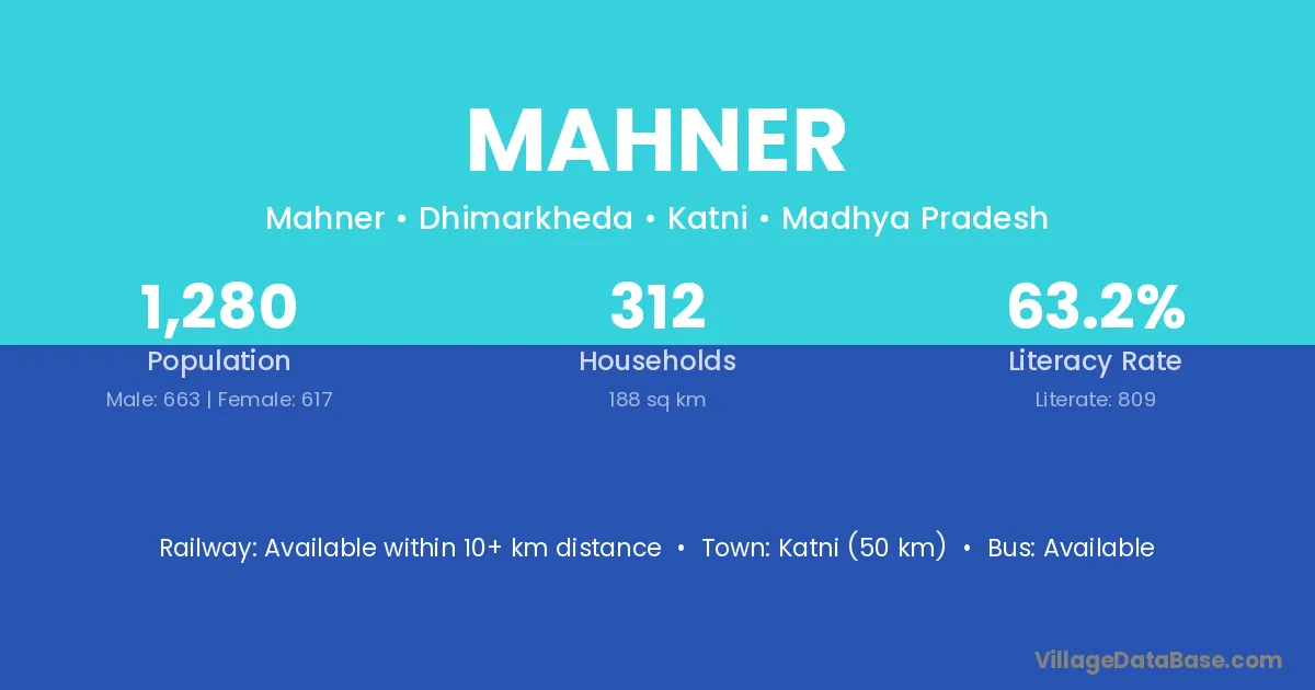 Katni (50 km) is the nearest town to Mahner village for major economic activities and is located approximately 50 km away.