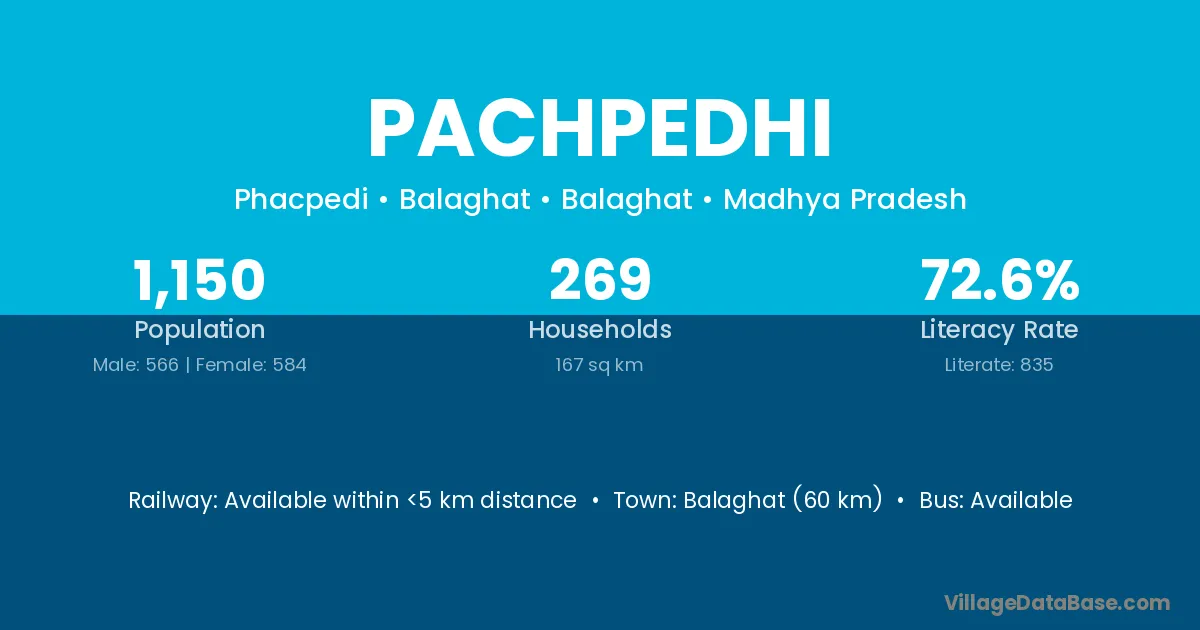Pachpedhi village has a total population of 1,233 people, of which 609 are males and 624 are females.