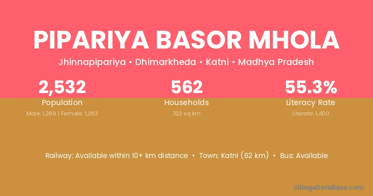Katni (62 km) is the nearest town to Pipariya Basor Mhola village for major economic activities and is located approximately 62 km away.