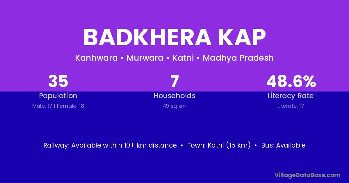 Katni (15 km) is the nearest town to Badkhera Kap village for major economic activities and is located approximately 15 km away.