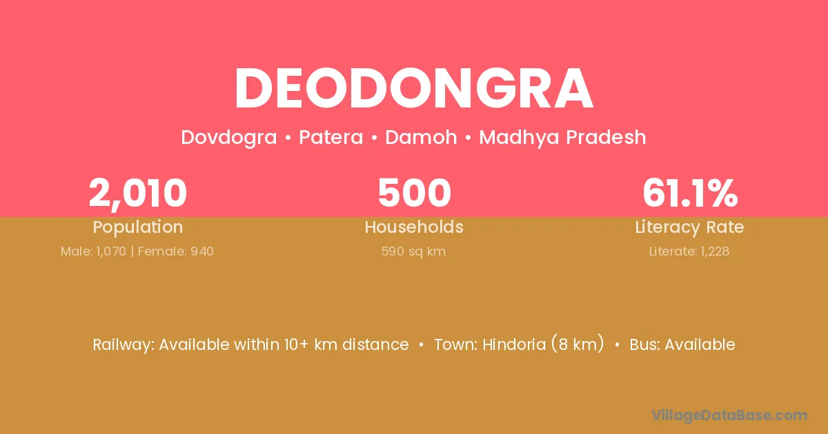 Katni (14 km) is the nearest town to Deodongra village for major economic activities and is located approximately 14 km away.