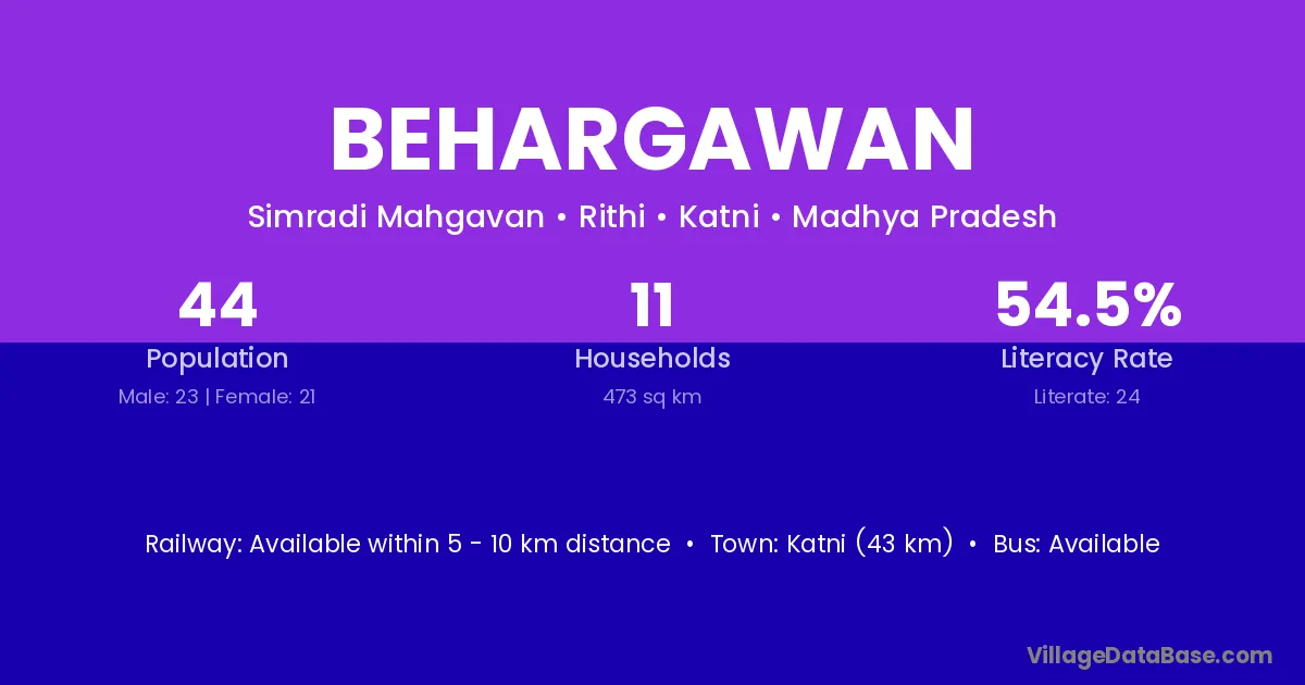 Katni (43 km) is the nearest town to Behargawan village for major economic activities and is located approximately 43 km away.
