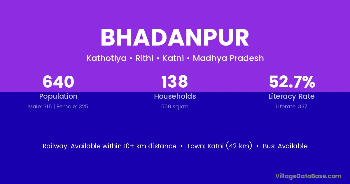Katni (42 km) is the nearest town to Bhadanpur village for major economic activities and is located approximately 42 km away.