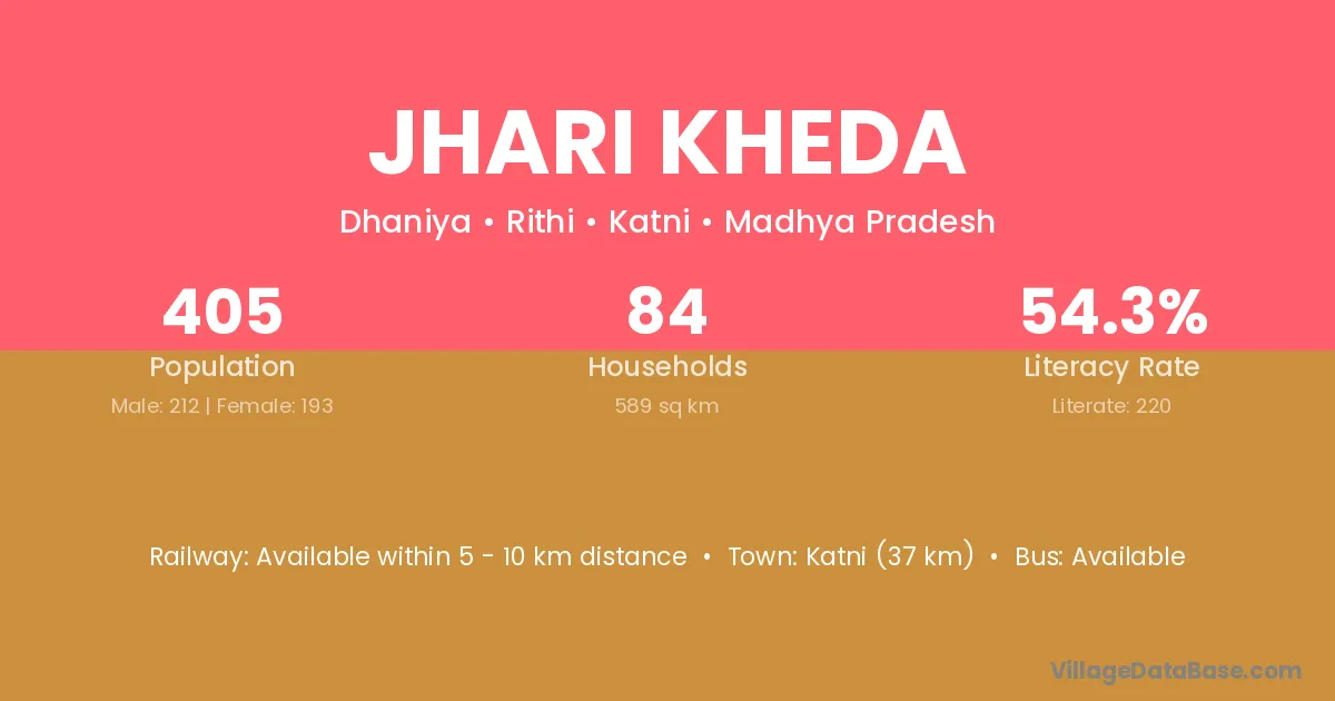 Katni (37 km) is the nearest town to Jhari Kheda village for major economic activities and is located approximately 37 km away.