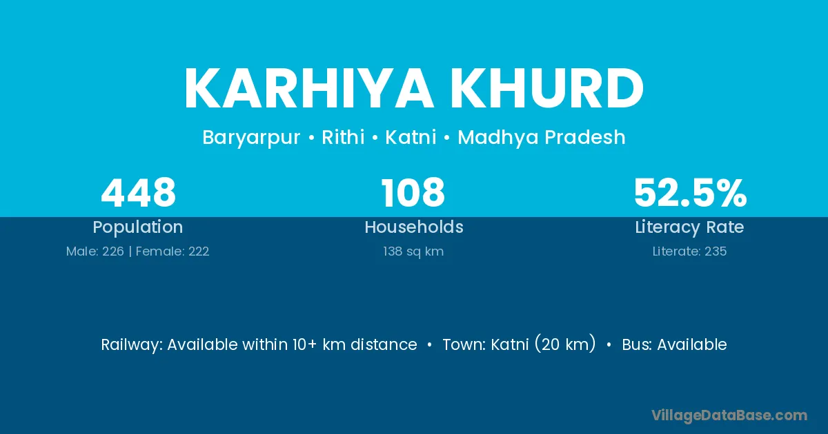 Katni (20 km) is the nearest town to Karhiya Khurd village for major economic activities and is located approximately 20 km away.