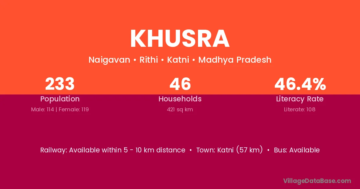 Katni (57 km) is the nearest town to Khusra village for major economic activities and is located approximately 57 km away.