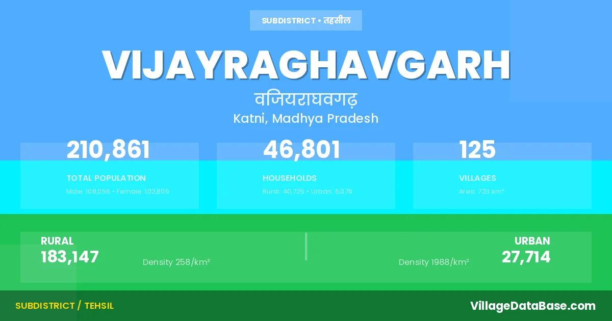 According to the 2011 census The total area of Vijayraghavgarh Tehsil is 723 km², with a population of 210861 people. The population density is 292 inhabitants per square kilometre, and there are approximately 46801 houses in the sub district.