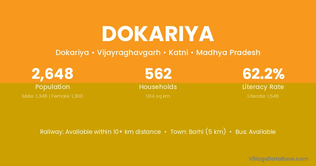 Barhi (5 km) is the nearest town to Dokariya village for major economic activities and is located approximately 5 km away.