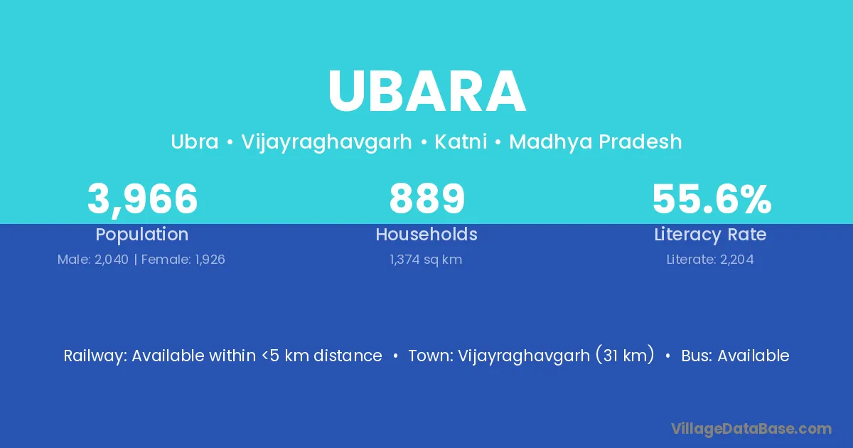 Vijayraghavgarh (31 km) is the nearest town to Ubara village for major economic activities and is located approximately 31 km away.