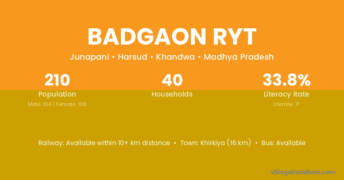 Khirkiya (16 km) is the nearest town to Badgaon Ryt village for major economic activities and is located approximately 16 km away.