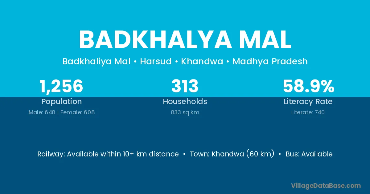 Khandwa (60 km) is the nearest town to Badkhalya Mal village for major economic activities and is located approximately 60 km away.