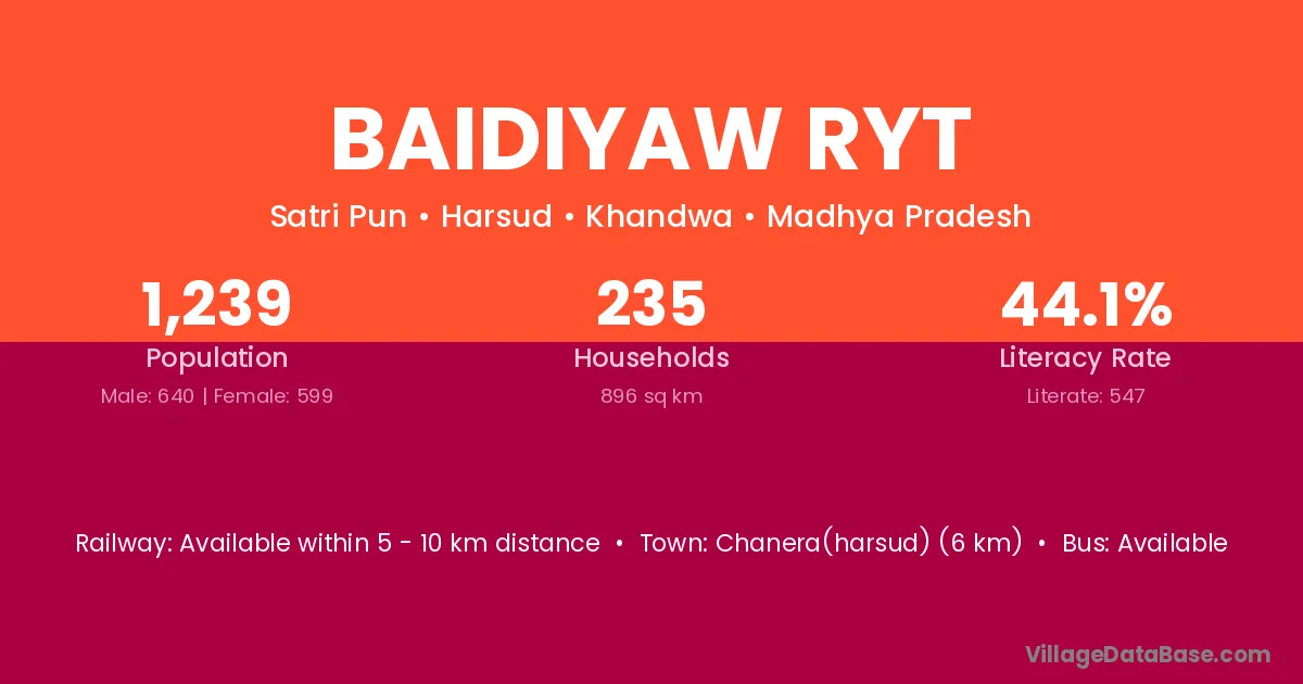 Chanera(harsud) (6 km) is the nearest town to Baidiyaw Ryt village for major economic activities and is located approximately 6 km away.