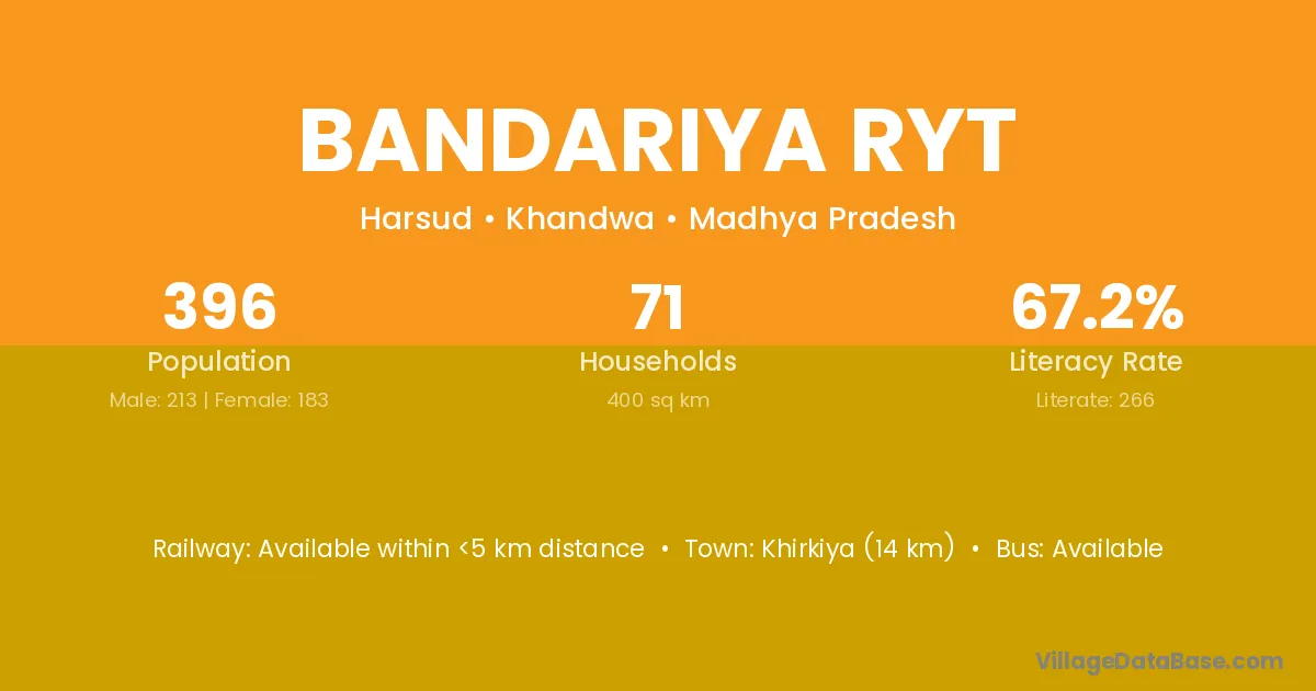 Khirkiya (14 km) is the nearest town to Bandariya Ryt village for major economic activities and is located approximately 14 km away.