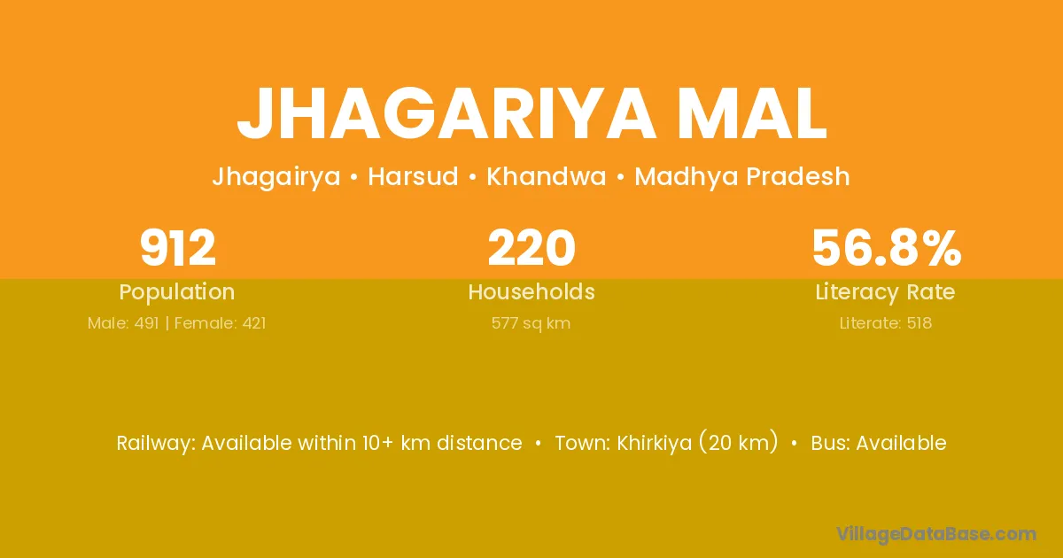 Jhagariya Mal village has a total population of 912 people, of which 491 are males and 421 are females.