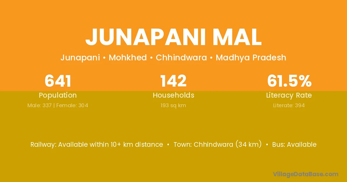 Khirkiya (20 km) is the nearest town to Junapani Mal village for major economic activities and is located approximately 20 km away.