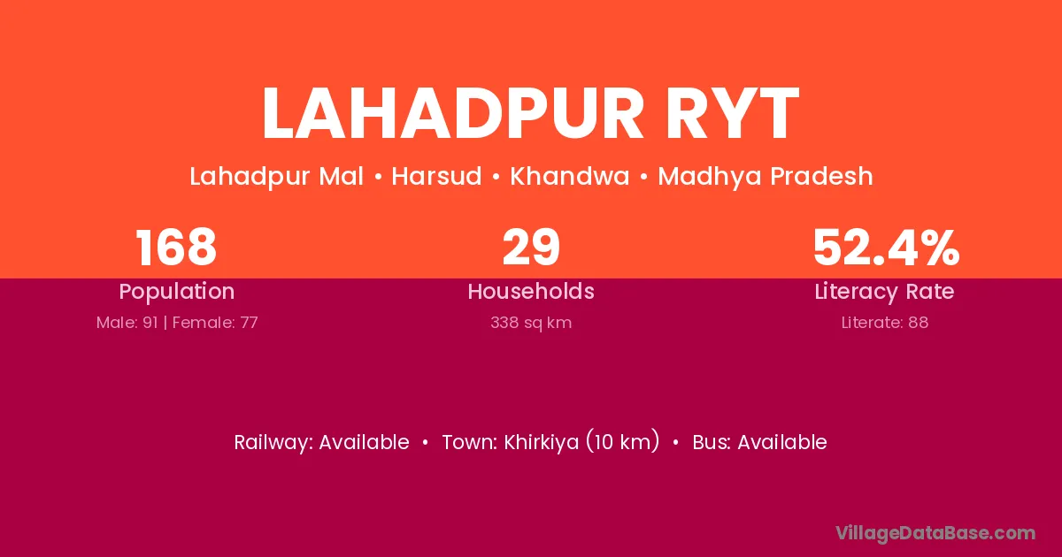 Khirkiya (10 km) is the nearest town to Lahadpur Ryt village for major economic activities and is located approximately 10 km away.