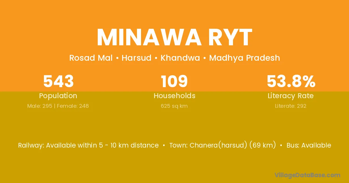 Chanera(harsud) (69 km) is the nearest town to Minawa Ryt village for major economic activities and is located approximately 69 km away.