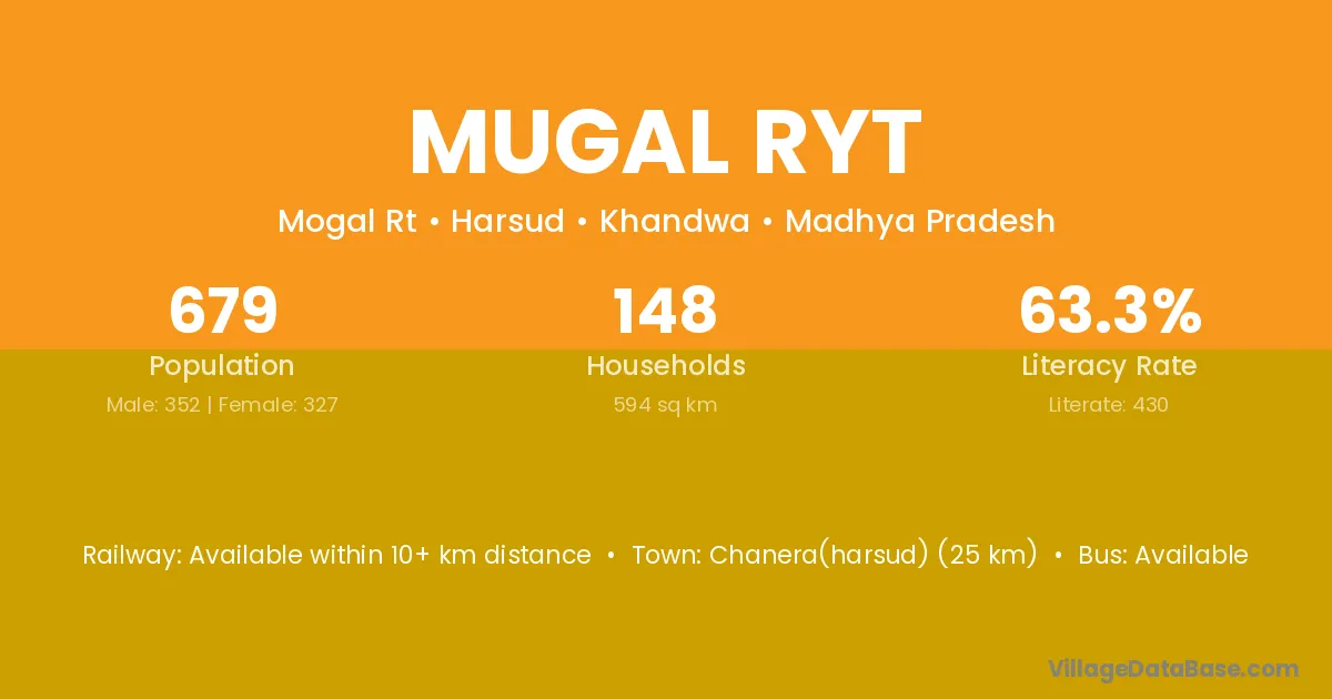 Chanera(harsud) (25 km) is the nearest town to Mugal Ryt village for major economic activities and is located approximately 25 km away.